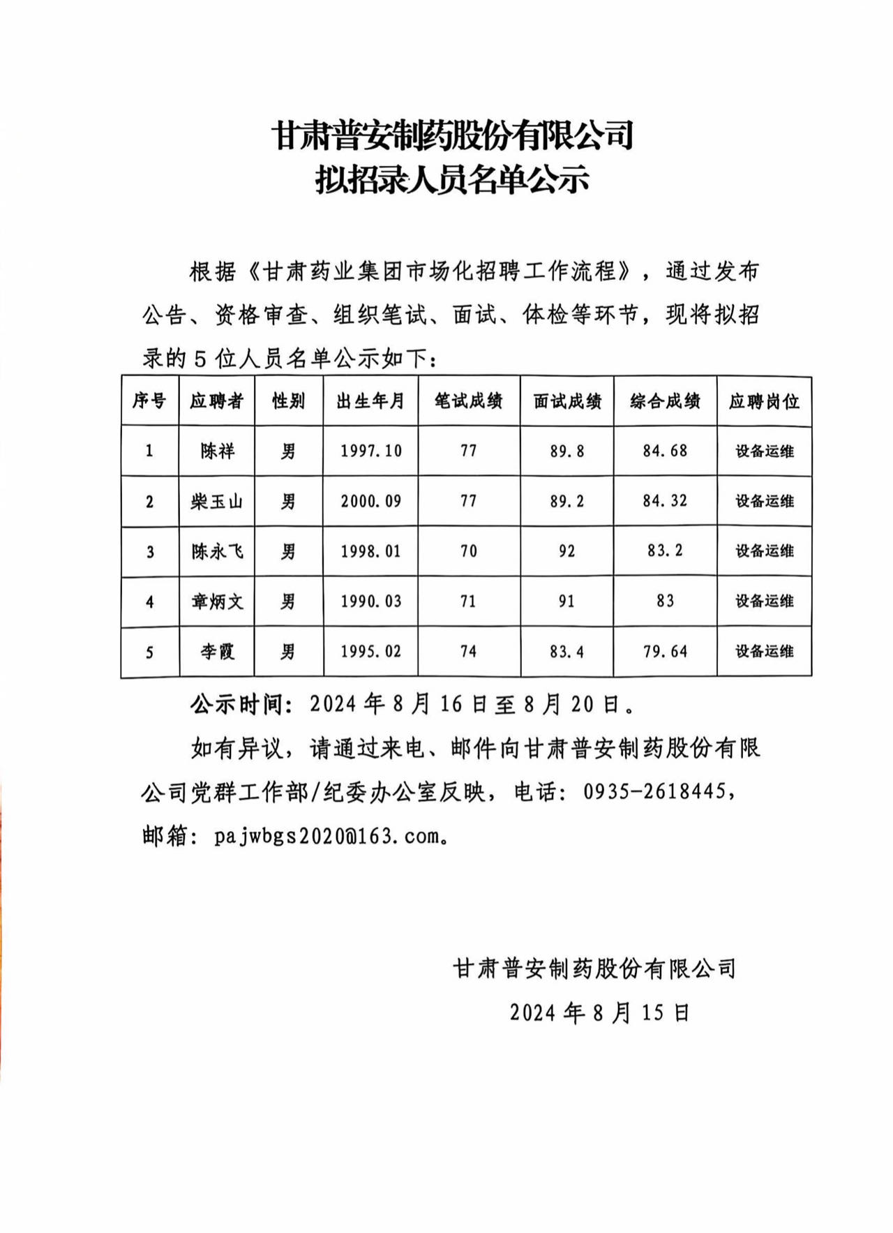 甘肅普安制藥股份有限公司 擬招錄人員名單公示