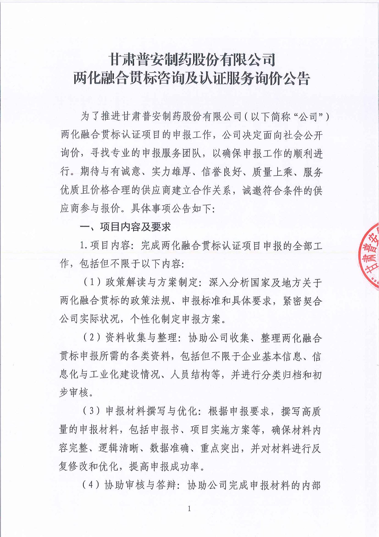 甘肅普安制藥股份有限公司兩化融合貫標咨詢及認證服務詢價公告
